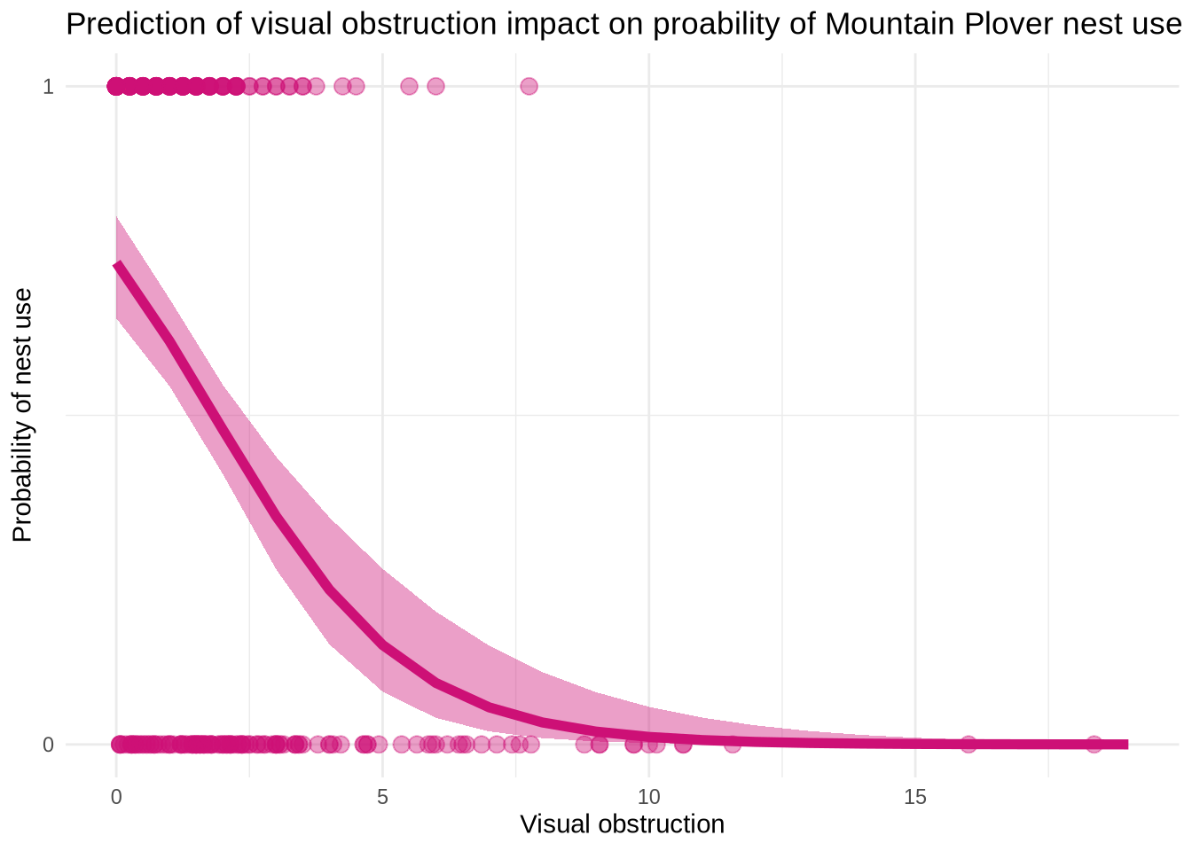 Figure 3. Maximum Likelihood Estimation(MLE) for nest use and visual obstruction. The points at the top of the graph( in the “1”portion) represent that there is a nest. The points at the bottom of the graph (in the “0” portion) represents that there is no nest. The shaded area that follows the line represents the 95% confidence interval around the predictions and the underlying data. The curved line in the middle represents model predictions. Data from: Duchardt, Courtney; Beck, Jeffrey; Augustine, David (2020). Data from: Mountain Plover habitat selection and nest survival in relation to weather variability and spatial attributes of Black-tailed Prairie Dog disturbance [Dataset]. Dryad. https://doi.org/10.5061/dryad.ttdz08kt7