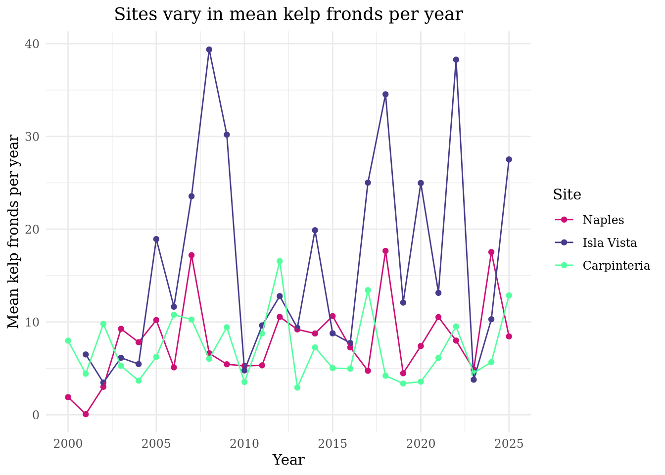 Isla Vista has the most variable mean kelp per year. Carpinteria has the least variable mean kelp fronds per year.