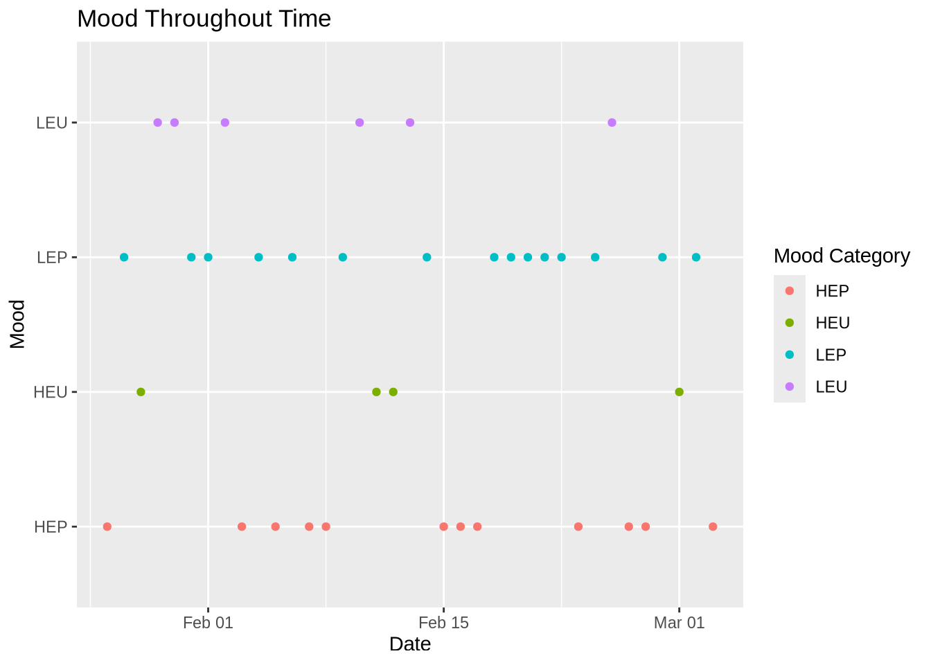 Figure 2. Mood Throughout Time. Each dot represents the mood I felt at the end of the day in regards of my attendance of going to jiu jitsu. It is split up into four mood categories: red is HEP( high energy positive), green is HEP( high energy unpleasant), blue is LEP( low energy positive), and purple is LEU( low energy unpleasant).